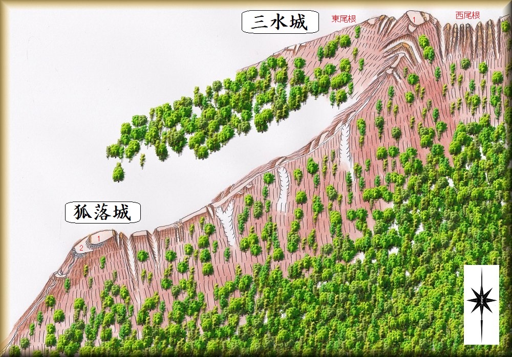 孤落城と三水城は、同じ山の尾根続きにあり、孤落城は、三水城の支城とみるべきものである。