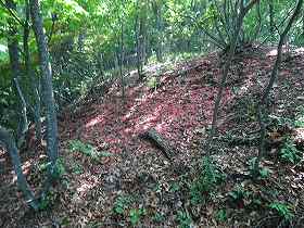 三水城に向かう途中の尾根には、細長い帯曲輪状のものがところどころにみられる。人工的な削平地とみられるもので城郭遺構として見てもよさそうに思われるのだが、防御構造としてはどれほどの効果があったものだろうか。この帯曲輪のうちの1つに山つつじの花びらがたくさん落ちていて、曲輪の斜面がピンク色に彩られているのが美しく、印象的であった。