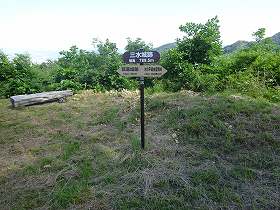 | 北側から遠望する孤落城と三水城。狐落城までの比高は250mほど。三水城はさらに120mほど上方にある。 | 北側山麓の村上國魂神社入口に立つ登山口の案内。 |