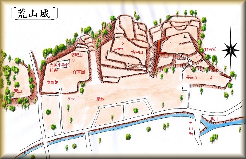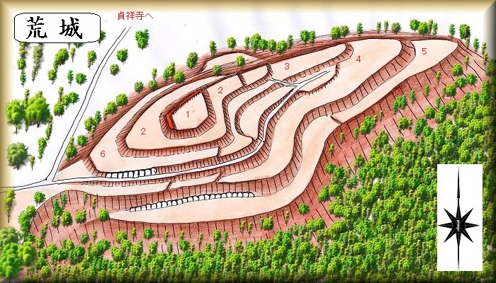 貞翔寺の南西300mほどのところにある比高90mほどの荒山が荒城の跡である。荒山と呼ばれている山に築かれているので、本来ならば荒山城と呼称すべき城であるが、すぐ近くにも荒山城と言う城があるので、混乱を避けるため、こちらは荒城とも呼ばれているようである。近くに同じ名称の城があるとは、ちょっとややこしい。