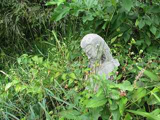 土塁はヤブが深くなっていたが、頑張って登ってみる。その上にはいくつかの石仏が立てられていた。この土塁の西側が深い堀切となっている。土塁の高さも相まって、その深さは10m以上といった大堀切である。