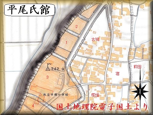 佐久市立平根小学校のある台地縁部が平尾氏館の跡であり、googlemapにも掲載されている。