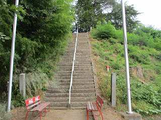 | 西側から遠望する深堀城1郭。 | 皇大神神社の石段。 |