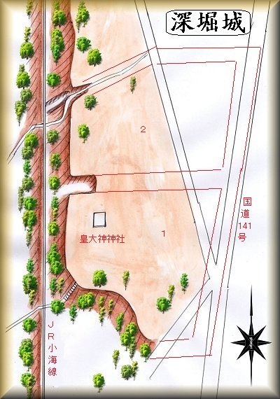 佐久市中込深堀にある皇大神神社の祭られている比高20mほどの台地縁部が深堀城の跡である。この神社は地図にも掲載されているので、この神社を目指していくのがよいと思われる。