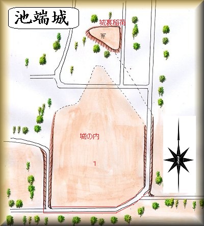 佐久市新子田の城裏神社の南側一帯が池端城の跡である。城裏神社は、その名の通り、城の真裏に位置していたものだと思われる。神社のあるところはちょっとした高台になっているのだが、この南側の土手は本来は、城の堀の土手の一部を形成していたのではないかと思われる。