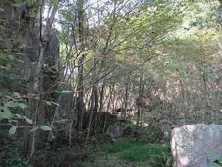 | 4郭。 | 作業道の脇の城塁は削られ岩盤が露出している。 |