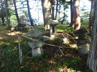 進んで行くと、高さ1mほどの切岸があり、その上が削平された土地になっている。さらにその先にも切岸があって、その上が最高所の平場である。これらの部分も含め、出城は一面のヤブの中である。それでもヤブをかき分けていくと、そこに小さな神社が祭られていた。このヤブ状態では、今では訪れてくる人はまったくいないのであろう。