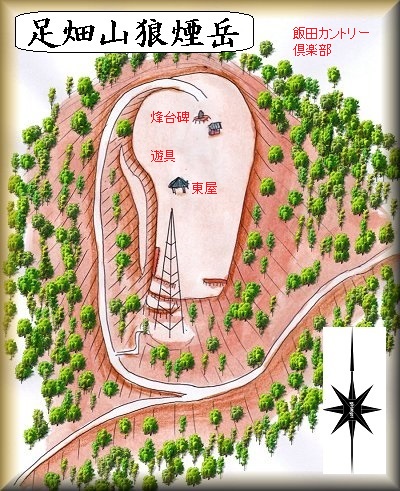 飯田カントリークラブの敷地に囲まれている比高50mほどの足畑山が、足畑山狼煙岳である。ゴルフ場の敷地内になっているので、無断立ち入りはできないのではないかと思っていたのだが、幸いにも狼煙台は公園となっていて、そこまで車でアクセスできるようになっていた。ただし、案内表示はない。