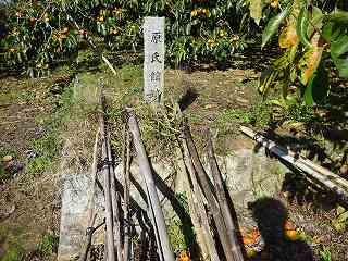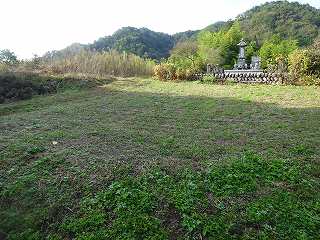 1郭内部はすでに耕作放棄されてしまったようでヤブ状態になっていた。しかし、低い切岸によって段差が付けられていることは何となく理解できる。その北側には墓地がある。