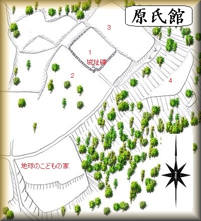 小松原城から東側に300mほど進んで行ったところに、「地球のこどもの家」という施設がある。これ以外に目印になるものがないので、これを目標にしていくとよいだろう。ここから台地を降らずに、北東方向に台地縁をまっすぐに進んで行ったところが原氏館の跡である。