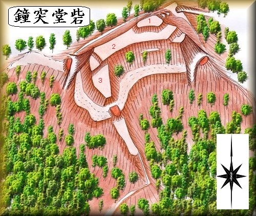 そこで、『信濃の山城と館』の図に基づいた鳥瞰図を参考までに掲示しておく。鐘突堂砦は、小規模ながら切岸を周囲にしっかりと巡らせた造作のきちんとした山城であったようである。