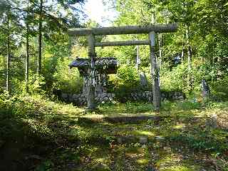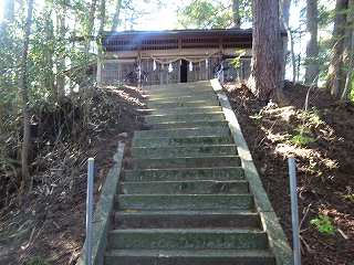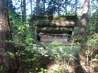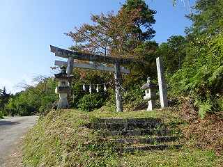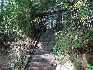 公民館から南側に向かって坂道を登って行くと、上の山稜に上がって行けそうな道が何となく見えている。水源があるらしく、ジメジメとした道であるが、これを進んで行くと切通しの道となり、その脇に神社が祭られているのが見えてきた。