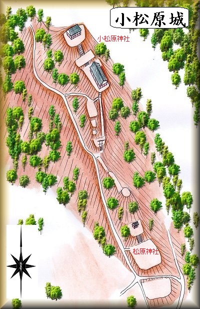 小松原神社の所から西方の城址下方向に続く道が付けられている。これを進んで行ったら、登り口が分かるのではないかと思って途中まで進んで行ってみたのだが、どこから取り付けばよいのか、さっぱりわからなかった。そんなこともあり、今回は登城していない。