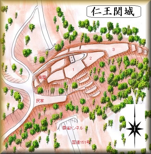 仁王関城は、国道151号線の雲雀トンネルの上の山稜に築かれていた。ちょうど、下条村と阿南町との境界上に位置している。下条氏と阿智町の関氏とは対峙関係にあったから、境目の城という目的を有していたのかもしれない。