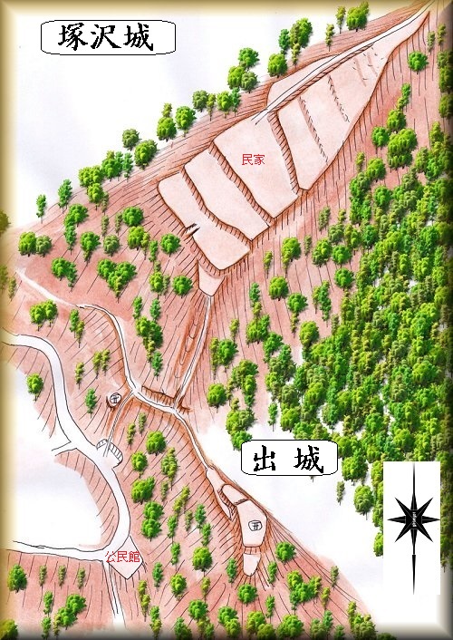 となると、塚沢城の城主も山田河内であったということになる。ところが、その山田河内が阿智町に所払いになって追われてしまった後、下条氏がこの城に入城し、下の出城部分に街道監視用の砦を築いたと地元では伝承されているという。