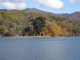 ヒーヒー文句を言いながら漕ぎ続けて、20分ほどで琵琶島に到着することができた。桟橋にボートのロープを結び付けて、さあ上陸だ! シーズンではないということもあってか、島には誰一人いない。湖全体を見渡してみても、自分のボートの他にはスワンボートが1隻浮かんでいるだけである。閑古鳥が鳴いている。観光地だというのにちょっとさびしい。