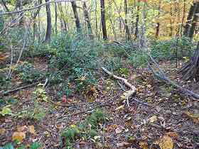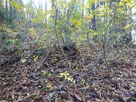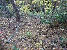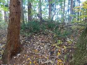 | 横堀の北側土塁の虎口・・・だが、ヤブでよく分からない。 | 1郭の虎口状窪み。 |