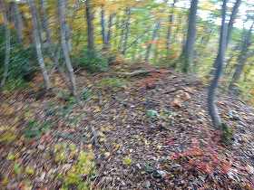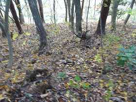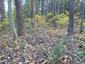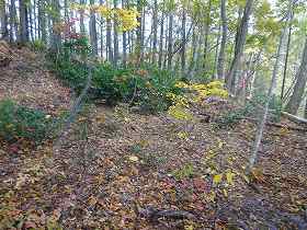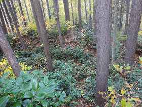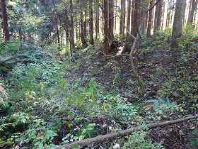 ひたすら斜面を登って行くと、南側の横堀の所に出た。ヤブはヤブなのだが、ちゃんと横堀と分かる状態であった。この横堀に沿って合計6本の竪堀が掘られている。現状ではかなり埋まっているようで、さほど明瞭なものではないが、往時はもっと鋭いものであったのだろう。