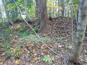 以上が明確に遺構として見られる部分である。全体に城址の西側半分は遺構がよく残されているのだが、道路の東側はほとんど不明瞭になっている。こちら側にはJR信越線の線路が通っているので、その工事の際に破壊された箇所もあるのかもしれない。