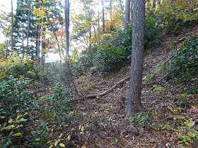 | 横堀の土塁には6本の竪堀が掘られている。 | 2郭下の城塁は崖のように削られた斜面となっている。 |