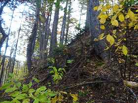 この道を進んで行くと、南側の尾根続きの所まで到達した。ここまで比高50m、ここから山頂までも比高50mほどであるが、ここから山頂部に向けて斜面が急峻になって行く。ヤブに付けられた道をかろうじて進んで行くのだが、ほとんど斜面直登の状態である。木の枝に掴まりながらよじ登って行く。