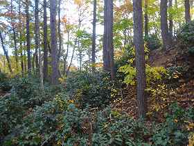 | 1郭横堀の土塁上から見る1郭城塁。雪椿がたくさん自生していて見通しが利かない。 | 1郭横堀内部。 |