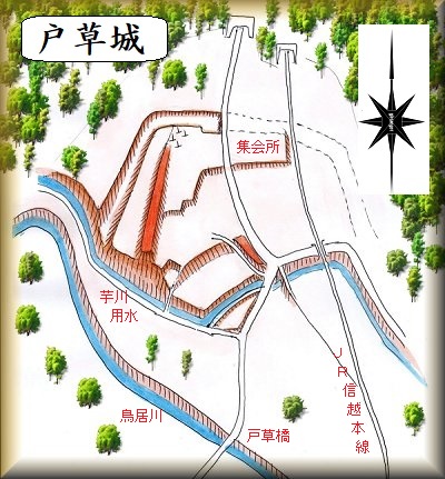 城の南側は一軒の民家となっている。南側下の芋川用水の方から見ると、用水の上に土手があり、その先にさらに高い土手があって、その上が民家の敷地となっている。この民家の辺りが戸草城の中心部分であったと考えられる。民家の入口の東側にも道路沿いに土塁が残っている。