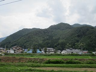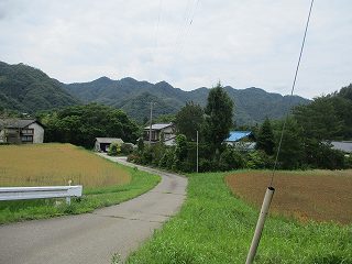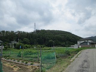 | 東方から遠望する西条城。ここからの比高は150mほどある。 | 長野自動車道の高架を抜けたあたり。正面奥が城山。ここで迷ってしまうのだが、正面の林道をまっすぐ進んで行く。 |