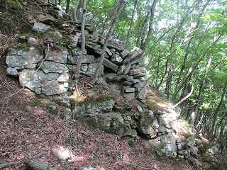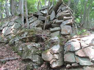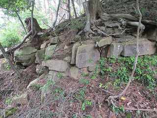 1郭背後の大堀切から南側にかけて、竪堀が掘られており、それに面する部分の腰曲輪の下にも石積みが見られた。この部分の石積みが城内で最も大規模なものであった。