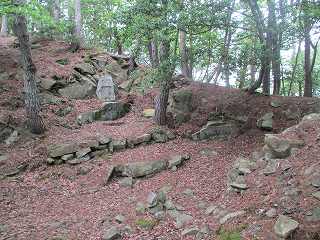 | 3郭から見る2郭城塁。明確な石積みが見られる。 | 2郭から1郭方向を見る。立派な城址碑が建てられている。 |