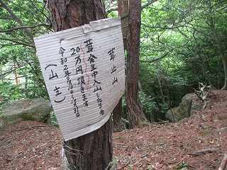 | その先の城塁にもあちこちに小規模な石積みが見られる。 | 登城道の側面部には「茸止山 罰金20万円」とった張り紙がある。20万円とはふっかけたものだが、登城道以外に入り込まなければ特に問題はない。 |