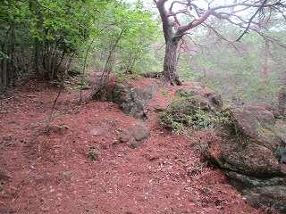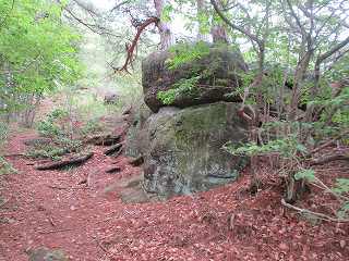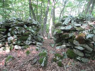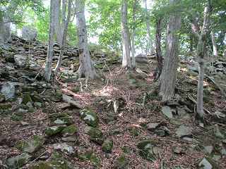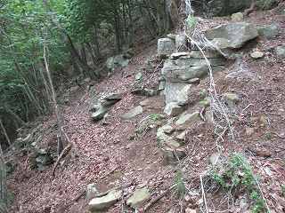 そうしているうちに再び道が現れて、ジグザグに進んで行く。その途中の脇には所々に石積みのようなものが見られる。ただし、この山にはもともと長方形に割れる自然岩があるようなので、単なる自然地形なのかもしれない。とはいっても明らかに石積みのように見えるものもある。このような位置からすでに石積みが積まれているとは、なかなか手が込んでいる。
