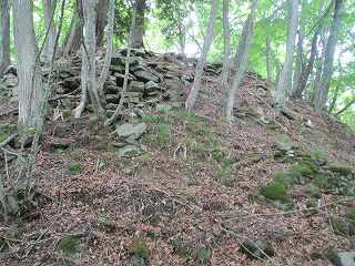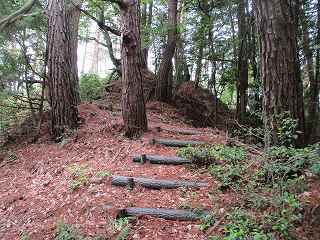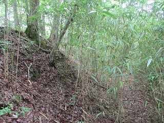| 竪堀の下方から大堀切を見たところ。 | 大堀切に面する腰曲輪の土塁。石が敷き詰められている。 |