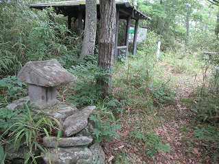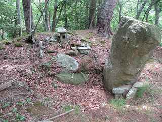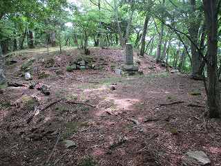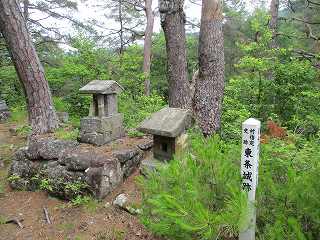 | 2郭に立てられている城址標柱。 | 1郭の土塁に祭られている祠。 |