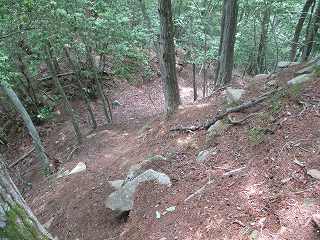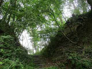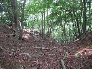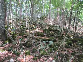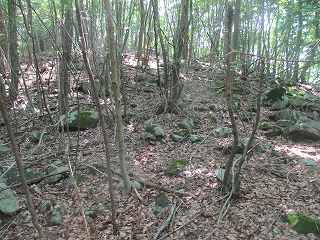 | 石積み状のものが見られる尾根を延々と登っていく。 | 4の先の堀切。見事な岩盤堀切である。 |