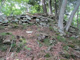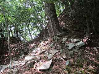 山道の側面部には石を並べた跡があった。ただし、これは城郭遺構というよりは先端部にあった虚空蔵堂への参道造成の際に積まれたものである可能性の方が高いであろう。