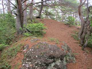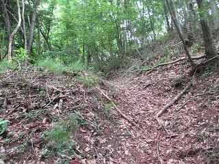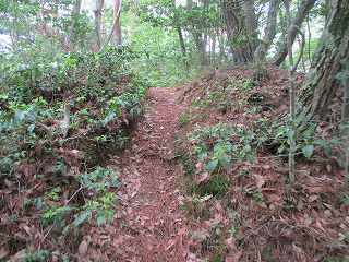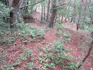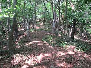 尾根は再び降って登りに差し掛かって行く。鞍部の辺りに堀切の痕跡があり、それを越えて登って行く。