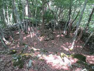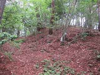 登って行った所に鉄塔の建てられている平場があり、その側面部には3段ほどの平場が造成されている。その途中には虎口状になっている個所もある。『信濃の山城と館』ではさらに上の6郭の部分を城主居館としているのだが、実際には山麓に近いこの辺りの方が居館を置くのにふさわしい場所のように感じる。