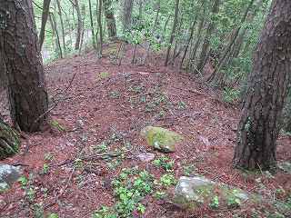 尾根続きにはさらに3本の堀切が掘られていた。最初の大堀切に比べれば後はいずれも小振りなものである。このうち一番尾根側の堀切の対岸に岩があり、ここまでで城域は終了する。