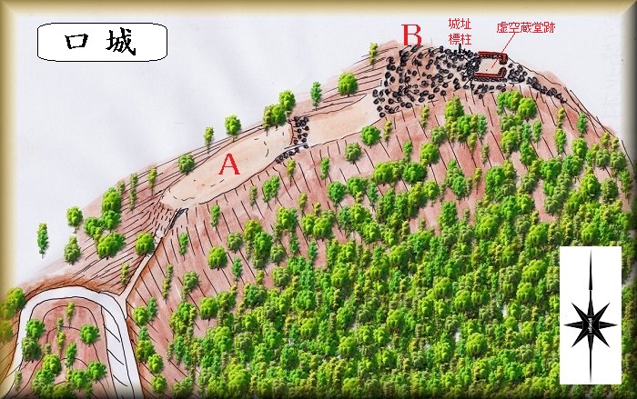 安坂城の西方に向かい合う比高150mほどの山稜部分が口城の跡である。