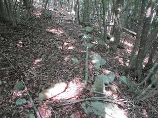| Aの入口側面に石積みが見られる箇所があるが、これはかつての参道に伴うものであろう。 | Aの先にも同様の石積みがあるが、これも参道用のものと判断。 |