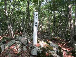 B地区にはひたすら石が転がっている。傾斜した地形がそのまま石によって埋め尽くされているような感じである。その最頂部の岩の上に「口司口城跡」と記された城址標柱が立てられていた。