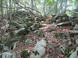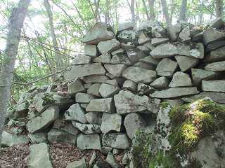 | 再び1郭背後の大堀切の所に戻ってきた。竪堀側面部に積まれた石積み。 | さらにその先の石積み。ここの石積みが一番規模が大きい。見事なものである。 |