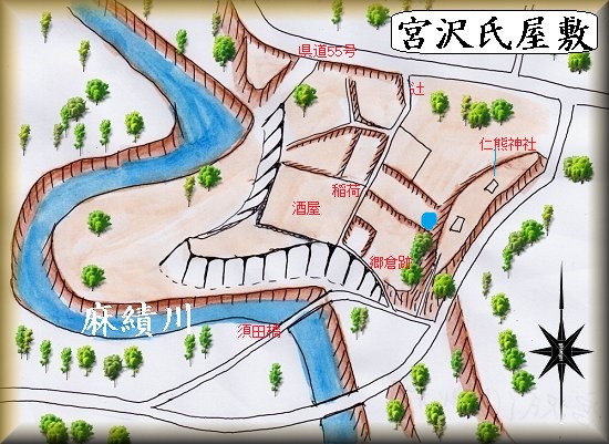 筑北村上手方の仁熊神社の西方の民家のあるところが宮沢氏屋敷の跡であるという。やはり麻績川が蛇行している上の段丘を利用したもので、周囲の土手は断崖状の地形となっている。