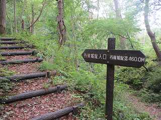 | 登城道入口の案内表示。この脇の山道を登って行く。最初は歩きやすい。 | すると獣除けの鉄柵の所に来る。この鉄柵は、左端を持ち上げれば上がって開けられるようになっているのだが、それがよく分からず苦労した。 |
