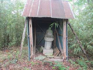 1郭の南側半分はヤブに埋もれてしまっていたが、道1本分だけはヤブが切り払われていたので、それを通って南側に降って行く。降りたところが2郭である。2郭には虚空蔵菩薩を祭った小屋があった。それにしても誰もいないこのような山中で見る仏像は、何だか不気味である。