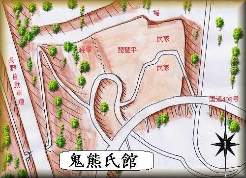 長野自動車道の東側で、国道403号線が大きく北側に回り込んでいる北側にある台地先端部分が鬼熊氏館の跡であるという。西条城のある山稜から東側に延びた台地状の地形で、100m四方ほどの規模がある。