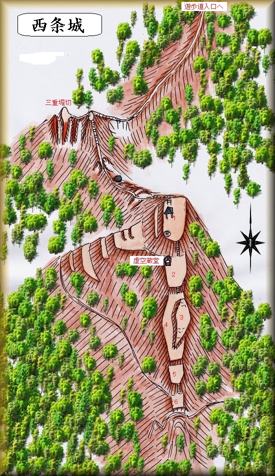 西側から西条城に続く遊歩道がありそうな気がするのだが、それがどこであるのかは確認していない。