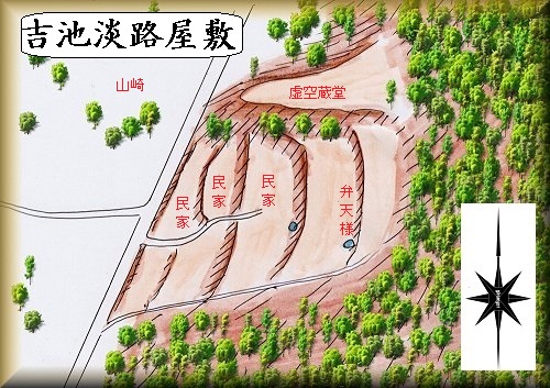 筑北村坂井山崎の、山稜谷戸部の集落のあるところが吉池淡路の屋敷跡であるという。