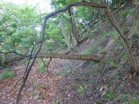 ここからン山頂部を目指す。西側に登っていく途中に、白い標柱が見えたので、城に関するものなのかと思ったのだが、実際には急傾斜崩落危険地域を示すものであった。この城には案内板のようなものは何もない。